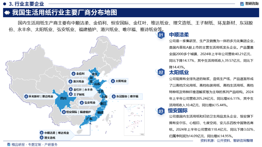国内生活用纸生产商主要有中顺洁柔、金佰利、恒安国际、金红叶、维达纸业、理文造纸、王子制纸、环龙新材、东冠股份、永丰余、太阳纸业、弘安纸业、福建植护、港兴纸业、唯尔福、雅诗纸业等。
