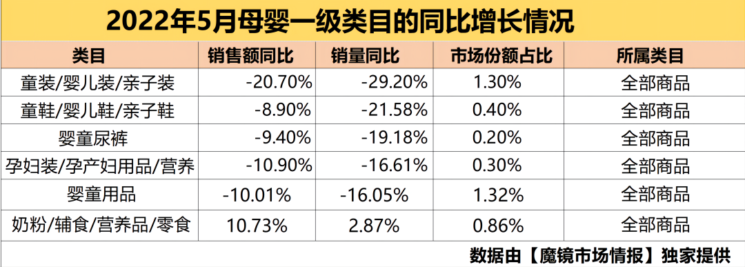为此,在最终结果没有出来之前,中童联合魔镜市场情报做了一次2022年5月的母婴品类同比分析。希望能从距离618最近的月份数据变化当中,找到一些蛛丝马迹:从去年到今年,哪些母婴品类在增长?哪些品类在下行?什么样的细分领域更有机会?新家庭到底更看重什么?未来的消费趋势在哪里?母婴企业值得在什么样的市场做更多投入?