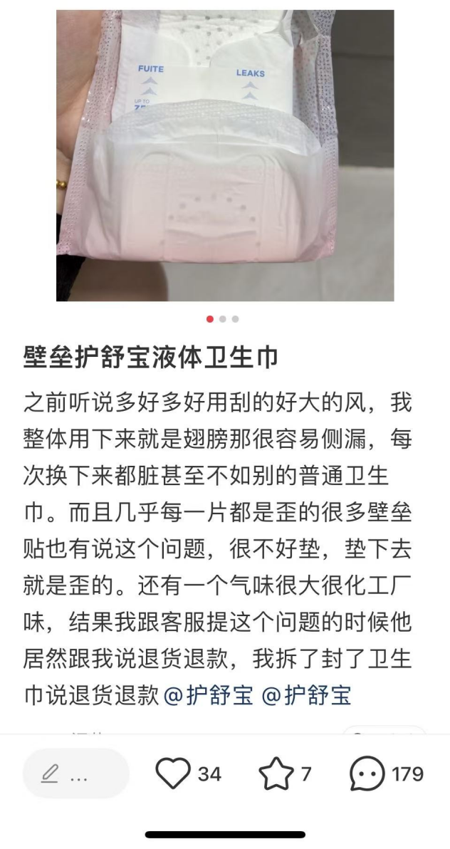 有消费者在护舒宝官方账号下留言:“侧漏真的很磨人……侧漏怎么就是解决不了,我都快被劝退了。” 更有人吐槽使用体验非常狼狈:“每次用它都得洗好几条裤子,侧漏到怀疑人生。”