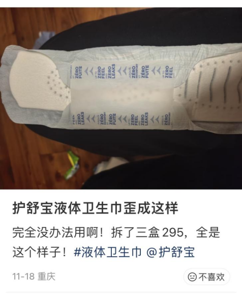 而早在2018年,《消费者报道》曾针对当时国内还是唯一一款的护舒宝Always未来感·极护液体卫生巾进行过测评,就有部分试用志愿者反映产品存在的一些使用体验问题,如“剪裁不够好,前半部分偏窄”“中间芯体窄”“透气性不足”等。7年过去了,关于其液体卫生巾的这类吐槽,依然还在社交媒体上出现。